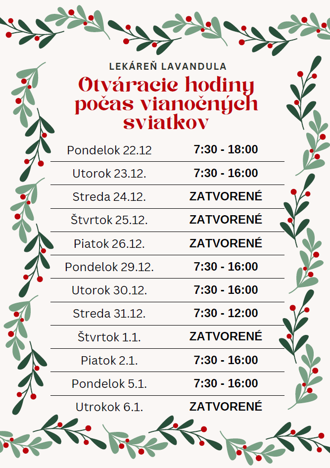 Pravidelne sa venujeme poskytovaniu odborných informácií a rád o liekoch, zdravotníckych pomôckach a dietetických potravinách pre pacientov a zákazníkov, zameraných na prevenciu zdravia a tiež zabezpečujeme bezplatné meranie tlaku, cukru v krvi a telesného tuku. Veľkosť novej lekárne dovoľuje výrazne rozšíriť sortiment liekov, zdravotníckych pomôcok a dietických potravín tak, aby každý našiel presne to, čo pre svoje zdravie potrebuje. Výrazne tomu pomáha aj zásobovanie lekárne LAVANDULA dvakrát denne a to ráno o 9.00 hod. a popoludní o 15.00 hod.